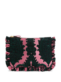 jacquard jeans clutch bag Highlights - Pink/black - Zip-fastening compartment - Patterned jacquard - Rectangle frame - Main compartment Made In Italy Composition Polyester 41%, Wool 22%, Acrylic 22%, Other fibres 8%, Silk 7% SIZE & FIT Measurement HEIGHT 9.05 in(23 cm) WIDTH 12.59 in(32 cm)