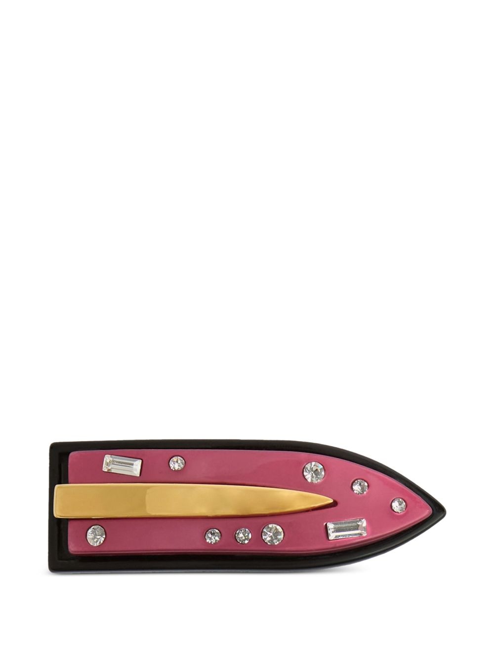 Jazzy hair clip Highlights - Purple - Clip fastening - Crystal embellishment - Gold-tone hardware - Pointed tip Made in Italy Composition Polyester 40%, Acrylic 35%, Brass 16%, Steel 5%, glass 4%