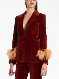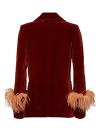 Keaton feather-trim velvet blazer La DoubleJ employs a luscious material and eye-catching detailing to enhance a classic design in the Keaton blazer. It is cut from dense, tactile velvet to a sleek single-breasted silhouette adorned with fluttery ostrich feathers at the cuffs. Highlights - Brick red - Cotton - Velvet - Feather detailing - Notched lapels - Front button fastening - Long sleeves - Chest welt pocket - Two front patch pockets - Straight hem Made in Italy Composition Cotton 98%, Ostrich Feather 2% SIZE & FIT Measurement SLEEVE LENGTH 24.01 in(61 cm) LENGTH 25.98 in(66 cm)
