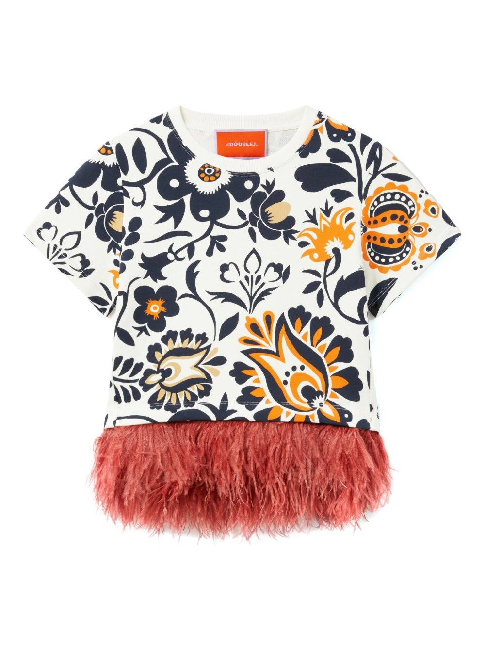 La Scala feather-trimmed floral-print T-shirt Highlights - Off-white - Floral print - Short sleeves - Round neck - Feather trim - Cotton Made in Italy Composition Cotton 98%, Ostrich Feather 2% Washing instructions Read Manufacturer Guidelines