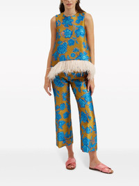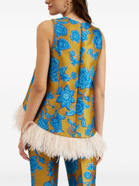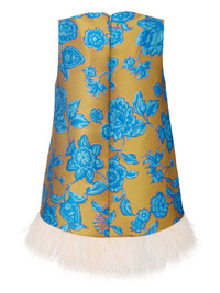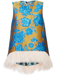 La Scala floral-jacquard blouse Highlights - Mustard yellow/turquoise blue-green - Silk blend - Patterned jacquard - Feather-trim detailing - Round neck - Concealed rear zip fastening - Sleeveless - Curved hem Made in Italy Composition Polyester 86%, Metal 5%, Silk 4%, Polyamide 3%, Ostrich Feather 2% SIZE & FIT Measurement LENGTH 24.4 in(62 cm) WAIST 37.79 in(96 cm) Washing instructions Read Manufacturer Guidelines