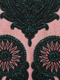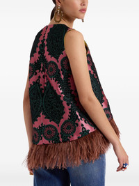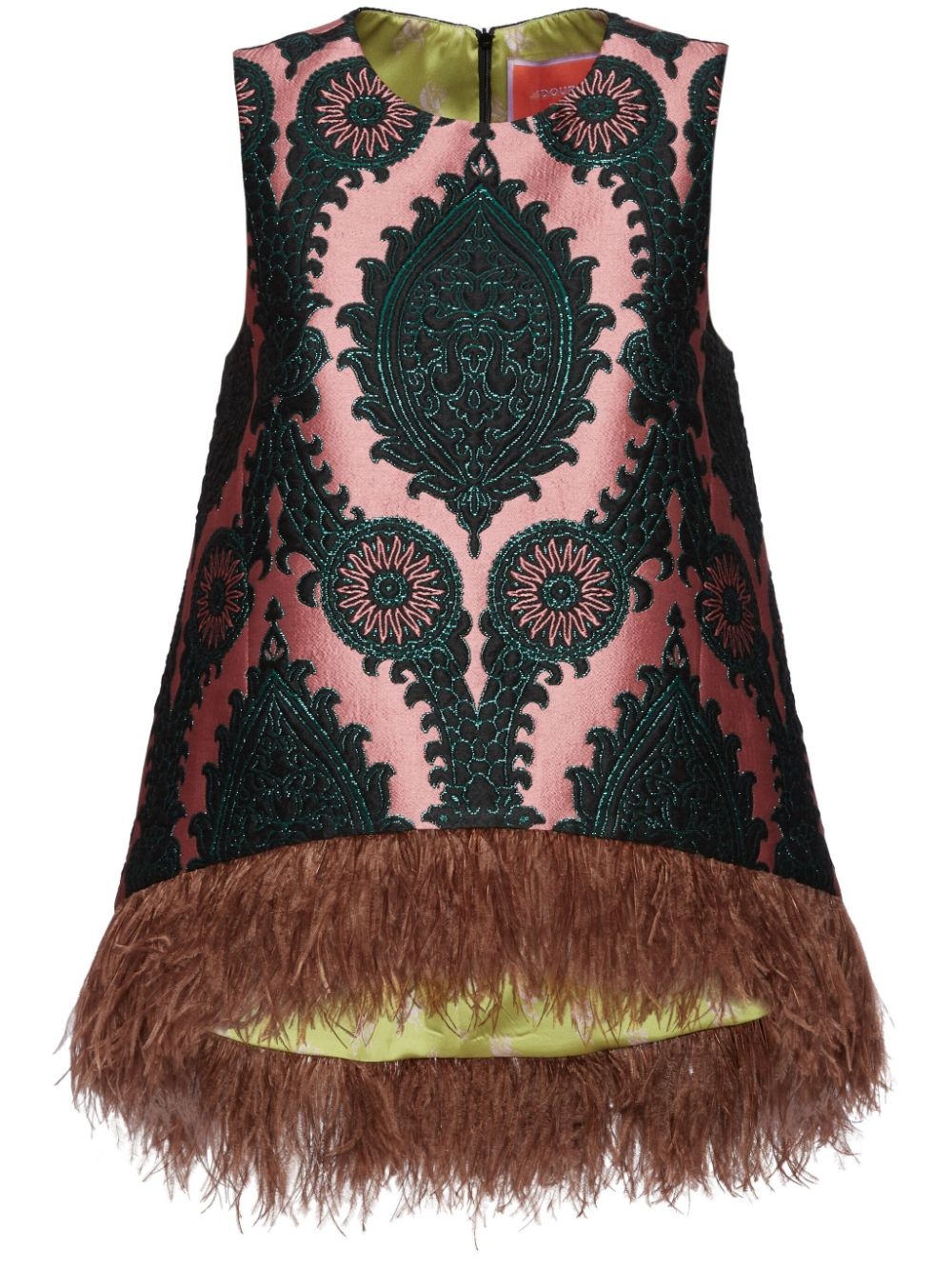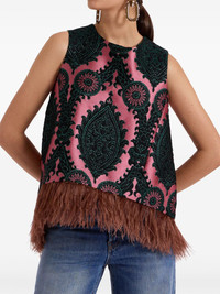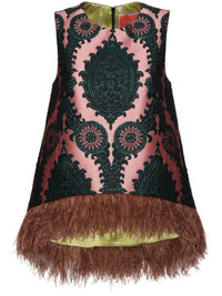 La Scala top Highlights - Bubblegum pink/dark green - Ostrich feather - Rear zip fastening - Patterned jacquard - Round neck - Sleeveless - Flared hem Made in Italy Composition Ostrich Feather 100%, Polyester 42%, Cotton 37%, Metal 9%, Silk 7%, Polyamide 5%