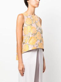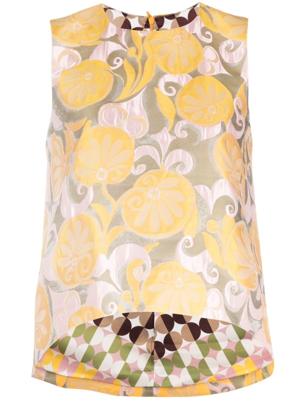 La Scapa jacquard top Founded in 2015, the Italian brand La DoubleJ is known for its artisan-made pieces that honour historical elements and archival prints. Embracing the brand's classic side, the La Scala top comes in a trapeze silhouette decorated with the brand's retro-inspired Moonflower jacquard. Highlights - Sunflower yellow/light pink/sage green - Patterned jacquard - Round neck - Sleeveless - Concealed rear zip fastening - Curved hem Made in Italy Composition Polyester 61%, Recycled Polyester 39% SIZE & FIT Model measurements Height 5 ft 11 in(1.8 m) Bust/Chest 31.49 in(80 cm) Hips 35.43 in(90 cm) Waist 24.4 in(62 cm) FittingInformation Designed for a relaxed fit, this piece allows for comfort and movement when worn Made from a midweight non-stretch fabric This piece fits true to size – take your usual size