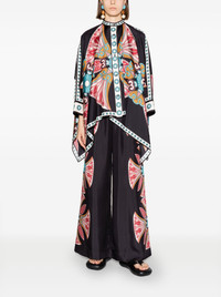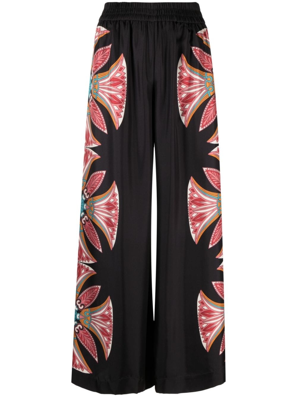 lotus-print silk palazzo pants La DoubleJ offers maximalist patterns and eye-popping colour palettes in honour of its Italian heritage. Cut from black lustrous silk to a palazzo silhouette, these La DoubleJ trousers are defined by their vibrant, stylised lotus print on the sides, skillfully placed by hand. Highlights - Black/multicolour - Silk - Palazzo design - Patterned floral print - Wide leg - High waist - Elasticated waistband - Two side slash pockets - Floor-length Made in Italy Composition Silk 100% SIZE & FIT Model measurements Height 5 ft 10 in(1.77 m) Bust/Chest 31.1 in(79 cm) Hips 35.03 in(89 cm) Waist 23.62 in(60 cm) Measurement INSIDE LEG 30.7 in(78 cm) HIPS 40.94 in(104 cm) WAIST 22.83 in(58 cm) FittingInformation Designed with a wide-leg cut, these trousers allow for a close fit at the waist and offer a loose and roomy fit over the leg The elasticated waist allows for a comfortable fit Made from a midweight non-stretch fabric This piece fits true to size – take your usual size Washing instructions Dry Clean Only