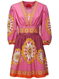 Margherita V-neck flared dress hot pink/multicolour cotton poplin texture flared skirt V-neck elasticated waistband three-quarter length puff sleeves above-knee length Made in Italy Composition Cotton 100%