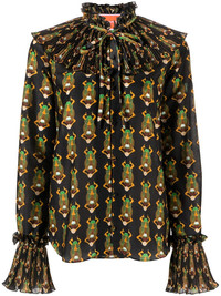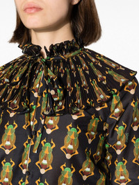Nefertiti scarab-print habotai blouse La Double J’s Nefertiti blouse takes its name from the artful scarab print that decorates it. It’s cut from cotton and silk-blend Habotai with a pleated bib collar and matching flared cuffs for added movement and texture. Highlights - Black/multicolour - Cotton-silk blend - All-over graphic print - Pleat detailing - Frilled high neck - Front button fastening - Long sleeves - Flared cuffs - Straight hem Made in Italy Composition Cotton 80%, Silk 20% SIZE & FIT Model measurements Height 5 ft 10 in(1.77 m) Bust/Chest 31.1 in(79 cm) Hips 35.03 in(89 cm) Waist 23.62 in(60 cm) FittingInformation Designed for a relaxed fit, this piece allows for comfort and movement when worn Made from a midweight non-stretch fabric This piece fits true to size – take your usual size Washing instructions Dry Clean Only