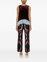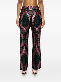 Oltrarno trousers Highlights - Pink/black/green - Textured finish - Patterned jacquard - Concealed front button, hook and zip fastening - Metallic threading - Belt loops - Two side slash pockets - Pressed crease - Two rear welt pockets - Flared hem Made in Italy Composition Outer: Polyester 41%, Wool 22%, Acrylic 22%, other fibers 8%, Silk 7% Lining: Polyester 100% SIZE & FIT Model measurements Height 5 ft 11 in(1.8 m) Bust/Chest 32.28 in(82 cm) Hips 35.03 in(89 cm) Waist 24.8 in(63 cm) FittingInformation Designed with a flared hem, these trousers allow for a close fit at the waist with a slim fit over the leg and widening towards the hem Made from a midweight non-stretch fabric