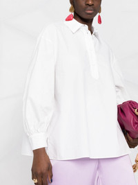 poet-sleeve poplin blouse La DoubleJ's blouse showcases the Milanese brand's refined style. Crafted from crisp cotton poplin, its silhouette is enhanced by voluminous poet sleeves. Highlights - White - Cotton - Poplin weave - Straight-point collar - Inverted pleat - Poet sleeves - Front button placket Made in Italy Composition Cotton 100% SIZE & FIT Model measurements Height 5 ft 10 in(1.77 m) Bust/Chest 32.28 in(82 cm) Hips 35.03 in(89 cm) Waist 25.19 in(64 cm) Washing instructions Machine Wash