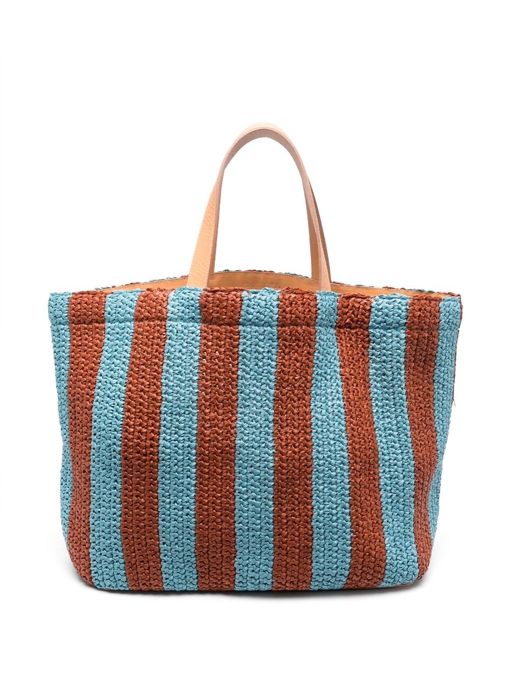 Riviera striped raffia tote bag Crafted from crochet raffia, La DoubleJ's striped Riviera tote bag is presented in a blue and brown colour palette – echoing the Milanese brand's sunny disposition. A generous main compartment adds practicality. Highlights - Sky blue/brown - Crochet raffia design - Leather top handles - Vertical stripe pattern - Main compartment - Unlined Imported Composition Outer: Raffia 100%, Rayon 80%, Leather 20% SIZE & FIT Model measurements Height 5 ft 11 in(1.8 m) Bust/Chest 31.49 in(80 cm) Hips 35.43 in(90 cm) Waist 24.4 in(62 cm) Measurement DEPTH 9.84 in(25 cm) HEIGHT 14.17 in(36 cm) STRAP 7.87 in(20 cm) WIDTH 23.62 in(60 cm)