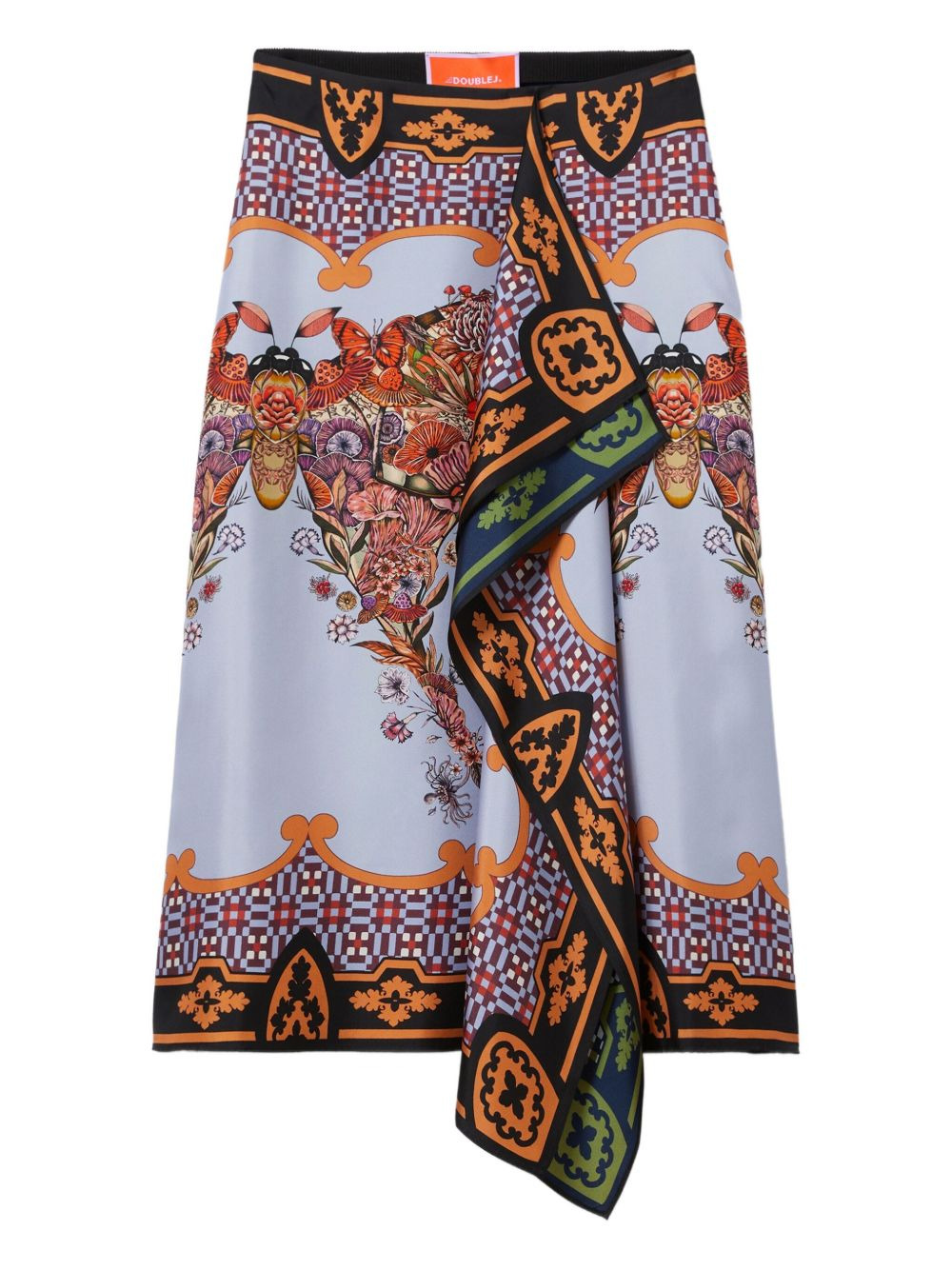 Scarf ruffled skirt Highlights - Light blue - Floral print - Ruffled asymmetric hem - Geometric border print - Silk - Insect motif Made in Italy Composition Silk 100% Washing instructions Read Manufacturer Guidelines
