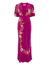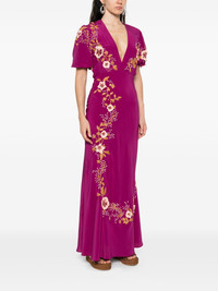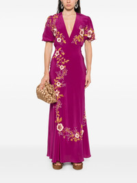 silk v-neck dress Highlights - Purple - V-neck - Flared hem - Short sleeves - Floral embroidery Made in Italy Composition Outer: Silk 100% Lining: Polyester 100% SIZE & FIT Model measurements Height 5 ft 9 in(1.75 m) Bust/Chest 32.67 in(83 cm) Hips 36.22 in(92 cm) Waist 24.8 in(63 cm) FittingInformation Designed for a slim fit that sits just away from the body offering a close yet comfortable fit Made from a lightweight non-stretch fabric Washing instructions Dry Clean Only