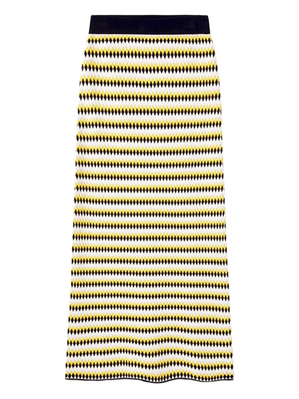 striped midi skirt Highlights - Yellow and navy blue - Geometric pattern - Elasticated waistband Made in Italy Composition Viscose 83%, Polyester 17% Washing instructions Read Manufacturer Guidelines