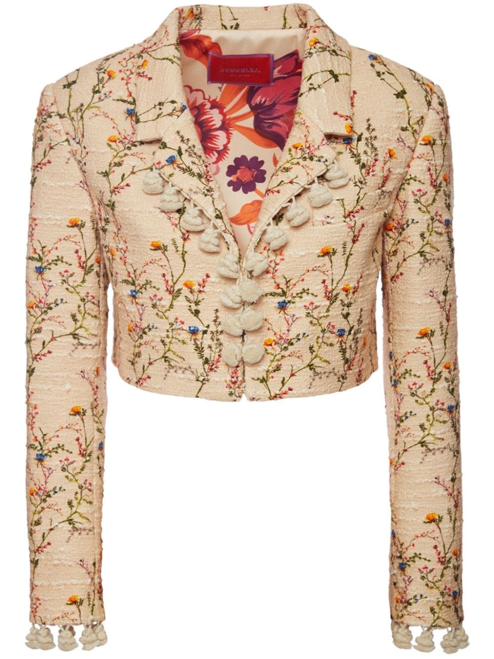 Torero embroidered cropped jacket Highlights - Cream white - Cotton blend - Slub texture - Floral embroidery - Tailored cut - Tassel trim - Notched lapels - Long sleeves - Rear curved hem - Cropped - Floral-print lining - Concealed front fastening Made in Italy Composition Cotton 97%, Polyamide 3% Washing instructions Read Manufacturer Guidelines