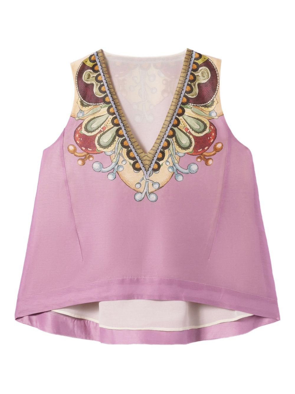 V-neck printed top Highlights - Dusty pink - V-neck - Sleeveless - Printed embellishment - Straight hem - Flax linen Made in Italy Composition Linen/Flax 48%, Cotton 28%, Silk 24% Washing instructions Read Manufacturer Guidelines