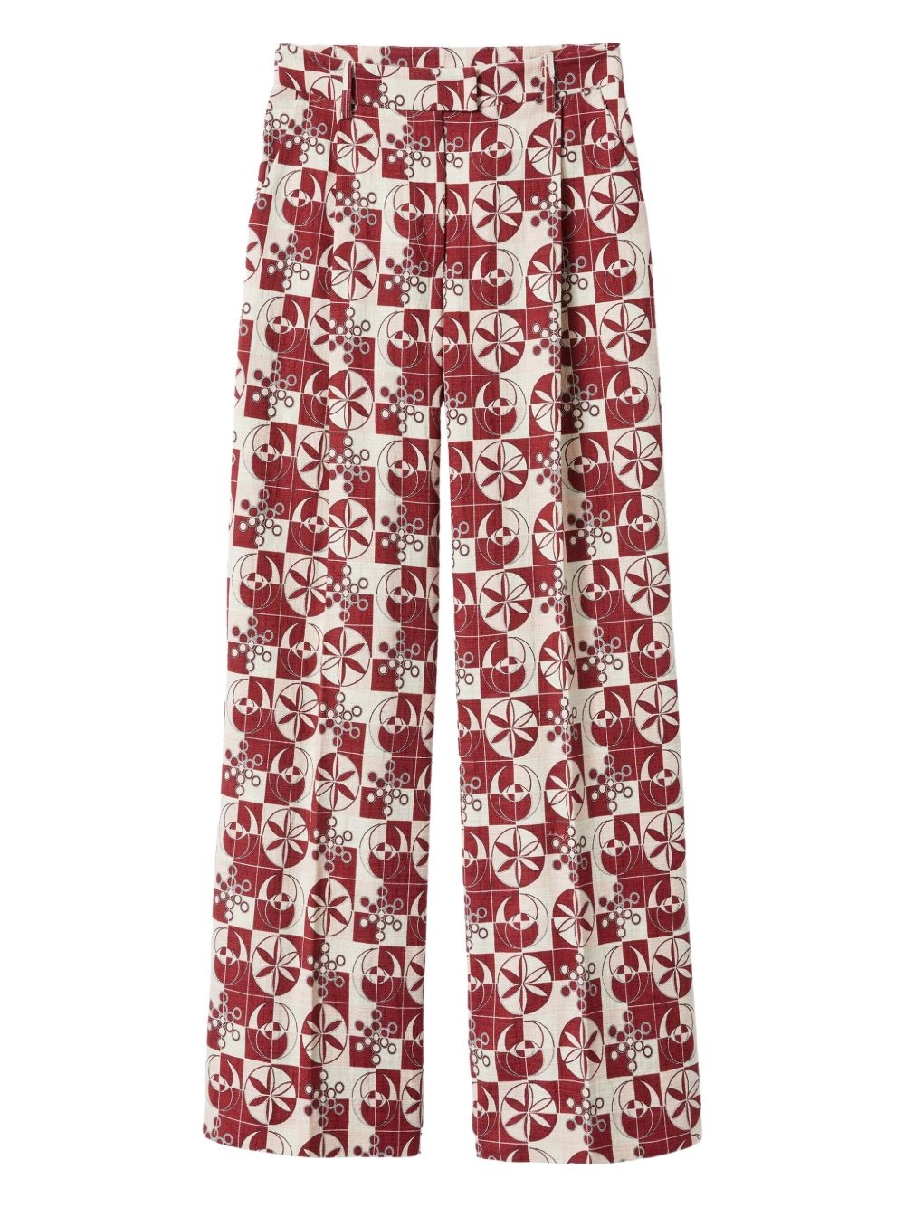 wide-leg pants Highlights - Red - Hook and zip fly fastening - Low-rise - Belt loops - All-over graphic print Made in Italy Composition Cotton 98%, Elastane 2%