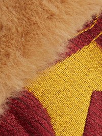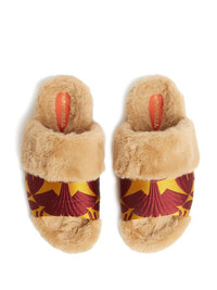 Winter jacquard slides Breathing life into the colder months, La DoubleJ presents its Winter slides. Lined and trimmed with faux fur to keep feet warm, it boasts a jacquard upper adorned with the brand's Papyrus pattern, in line with the brand's preference for bold, lively motifs. Highlights - Beige/burgundy/mustard yellow - Patterned jacquard - Faux-fur trim - Round open toe - Single toe strap - Slip-on style - Branded insole - Flat rubber sole Made in Italy Composition Silk 100%
