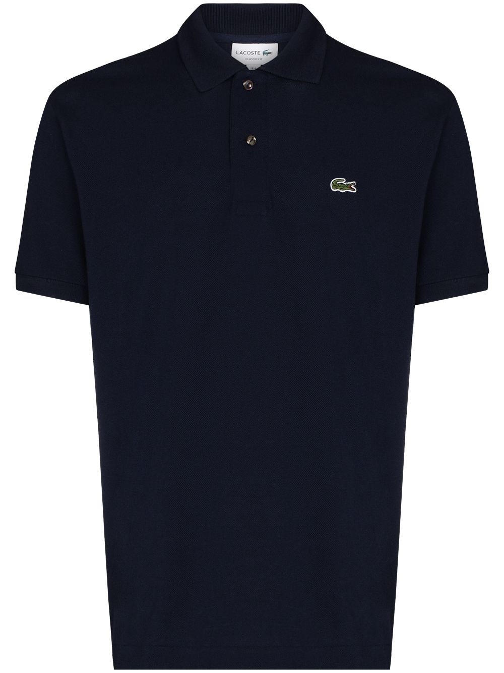 logo-applique polo shirt Let's go back to basics. Lacoste's black polo shirt is perfect for a whole host of smart-casual events, so you have one less thing to worry about when you're getting ready. You're welcome. Highlights - Navy blue - Short front button fastening - Polo collar - Short sleeves - Embroidered logo at the chest Imported Composition Cotton 100% SIZE & FIT Model measurements Height 6 ft 2 in(1.88 m) Bust/Chest 37.4 in(95 cm) Hips 37.79 in(96 cm) Waist 30.31 in(77 cm) FittingInformation This piece fits true to size. We recommend you get your regular size Cut for a relaxed fit Made with a mid-weight fabric
