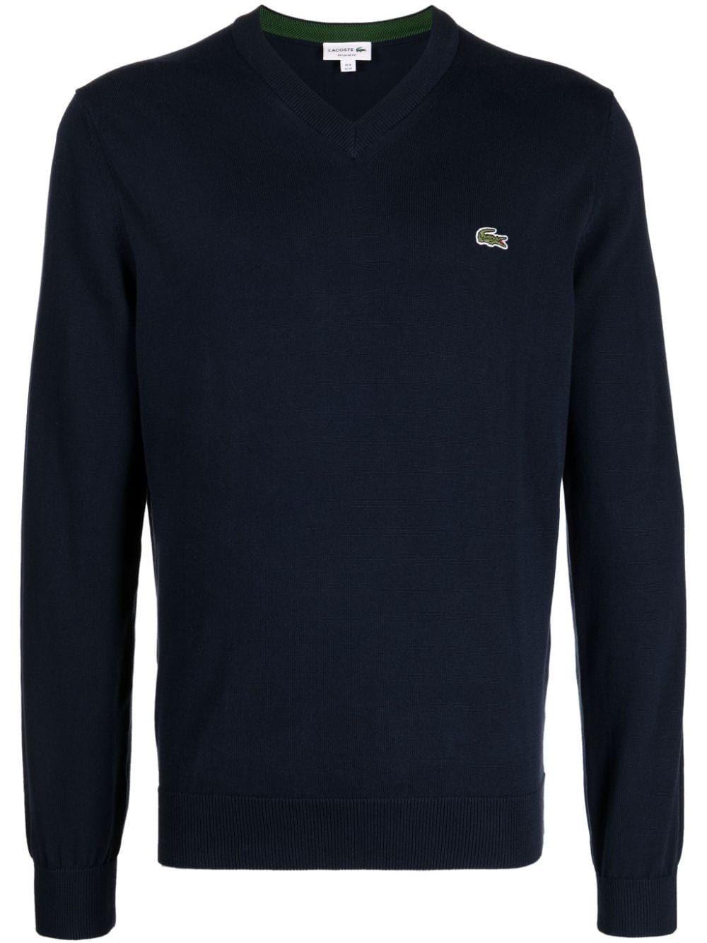 logo-embroidered fine-ribbed jumper Highlights - Navy blue/green - Cotton - Knitted construction - Logo patch at the chest - Ribbed trim - V-neck - Long sleeves - Straight hem Imported Composition Organic Cotton 100% SIZE & FIT Model measurements Height 6 ft 2 in(1.87 m) Bust/Chest 34.25 in(87 cm) Hips 36.22 in(92 cm) Waist 29.52 in(75 cm) FittingInformation Designed for a regular fit, offering a comfortable loose fit throughout the body The ribbed hem offers a close, comfortable fit Made with a midweight knit, this piece offers some stretch This piece fits true to size – take your usual size Washing instructions Machine Wash
