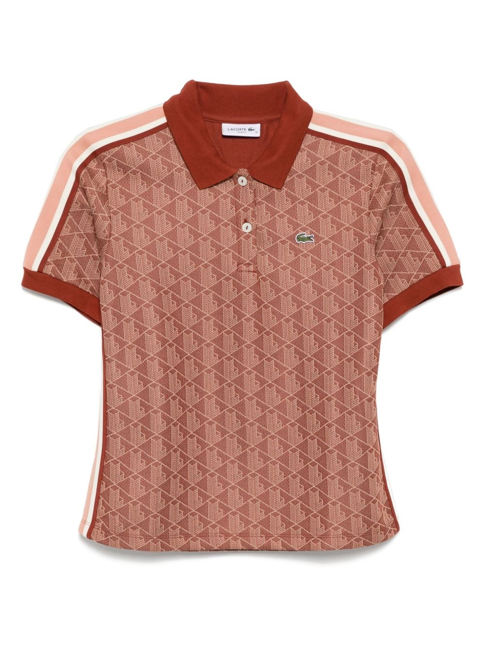 monogram jacquard polo top Highlights - Rust brown - Short front button fastening - Polo collar - Logo patch at the chest Imported Composition Polyester 59%, Cotton 38%, Polyamide 3%