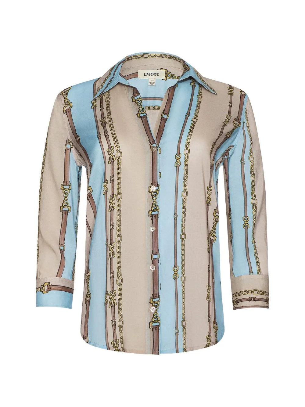 Camille belt stripe blouse Highlights - Neutral and blue - Chain print - Button fastening - V-neck - Buttoned cuffs Imported Composition Viscose 100% Washing instructions Dry Clean Only