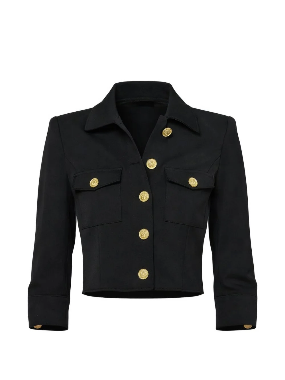 coin button jacket Highlights - Black - Gold-tone hardware - Chest flap pockets - Button fastening - Three-quarter length sleeves - Buttoned cuffs Imported Composition Polyester 68%, Rayon 29%, Spandex/Elastane 3% Washing instructions Read Manufacturer Guidelines
