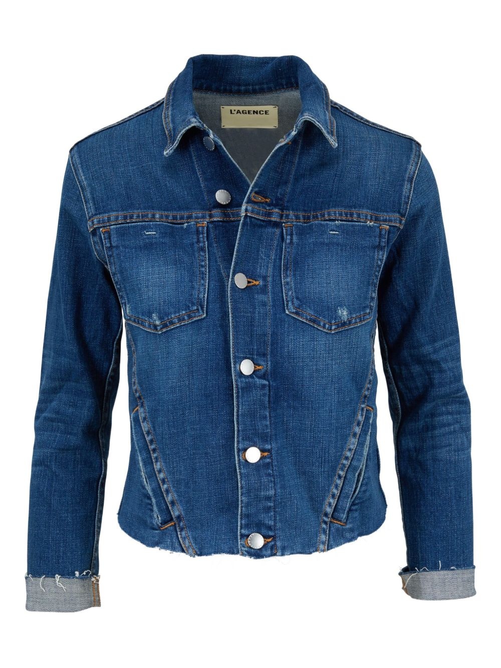distressed denim jacket Highlights - Medium blue - Button fastening - Pointed collar - Chest pockets - Frayed hem - Long sleeves Made in United States Composition Cotton 94%, Polyester 5%, Spandex/Elastane 1%