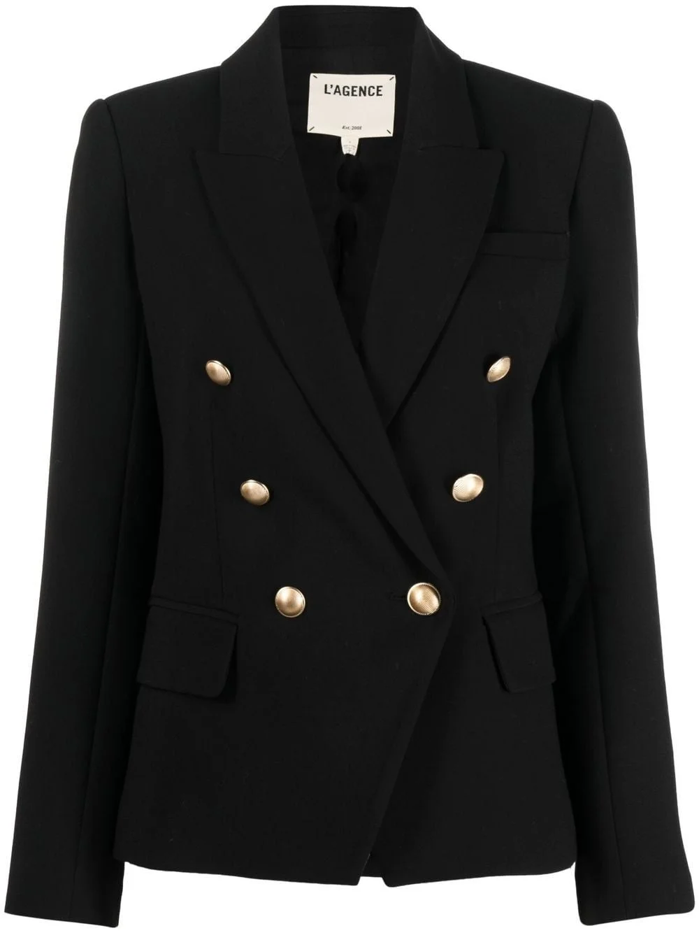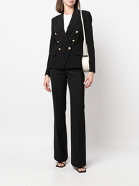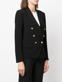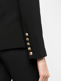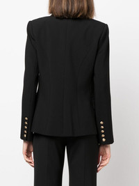 double-breasted blazer black double-breasted button fastening gold-tone buttons peak lapels long sleeves buttoned cuffs chest welt pocket two front flap pockets shoulder pads fitted waistline straight hem full lining Imported Composition Outer: Polyester 73%, Viscose 20%, Spandex/Elastane 7% Lining: Polyester 100% SIZE & FIT Model measurements Height 5 ft 9 in(1.76 m) Bust/Chest 33.07 in(84 cm) Hips 34.64 in(88 cm) Waist 25.59 in(65 cm) FittingInformation This piece fits true to size. We recommend you get your regular size Cut for a slim fit Made with a mid-weight fabric Washing instructions Dry Clean Only