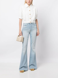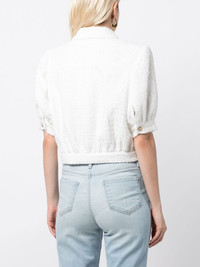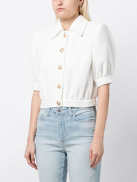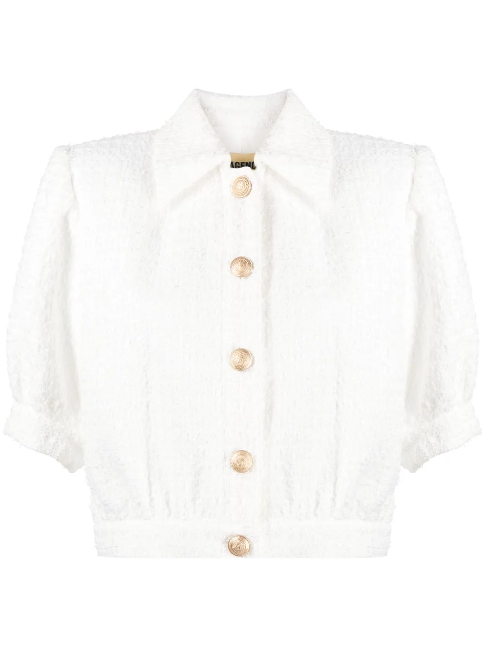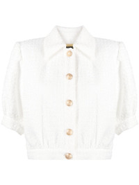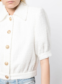 flat-collar tweed cropped jacket Highlights - Milk white - Tweed - Pointed flat collar - Gold-tone buttons - Front button fastening - Half-length sleeves - Straight hem - Cropped Imported Composition Polyester 100% SIZE & FIT Model measurements Height 5 ft 9 in(1.76 m) Bust/Chest 31.1 in(79 cm) Hips 35.03 in(89 cm) Waist 24.4 in(62 cm) FittingInformation Designed to be unstructured, offering a loose fit throughout The internal shoulder pads offer a structured shape Made from a midweight non-stretch fabric This piece fits true to size – take your usual size