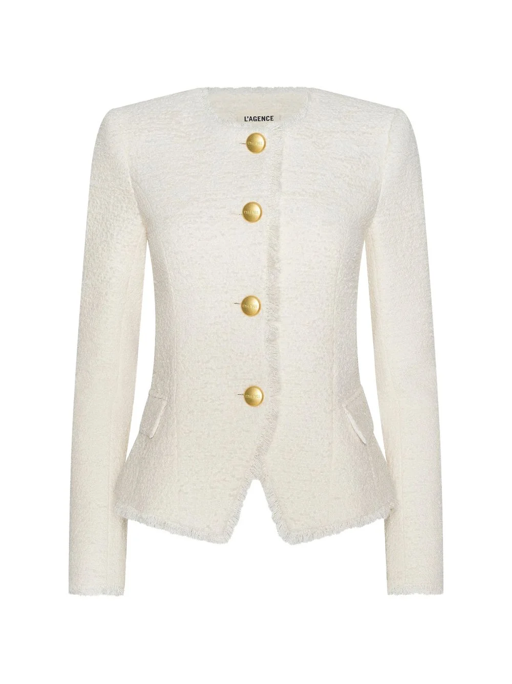 Nerina tweed jacket Highlights - Ivory white - Tweed - Button fastening - Side flap pockets - Frayed trim Imported Composition Polyester 100% Washing instructions Read Manufacturer Guidelines