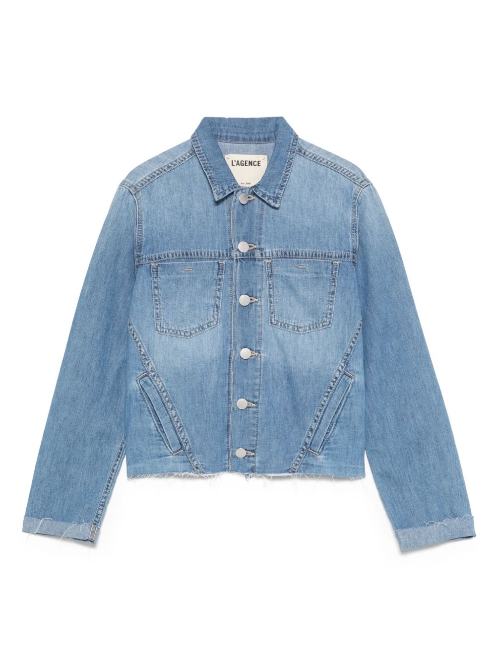 seam-embellished denim jacket Highlights - Light blue - Front button fastening - Two chest patch pockets - Two side welt pockets - Classic collar Made in United States Composition Lining: Polyester 65%, Cotton 35% Outer: Cotton 100% Washing instructions Machine Wash