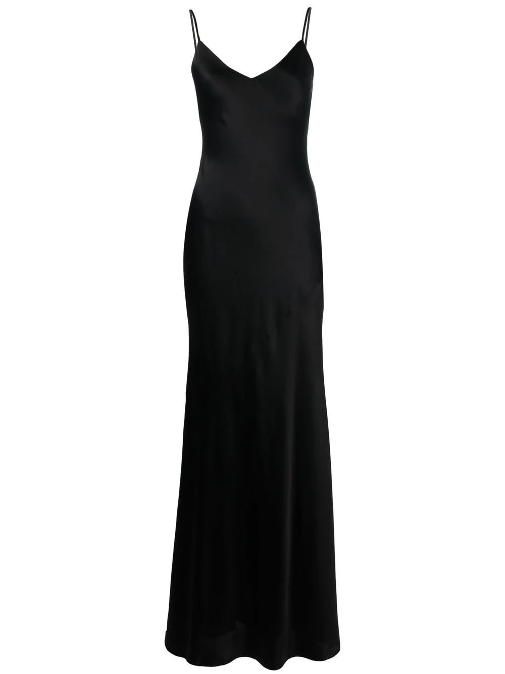 silk slip dress jet black silk blend spaghetti straps plunging V-neck flared hem maxi Imported Composition Outer: Silk 100% Lining: Polyester 100% SIZE & FIT Model measurements Height 5 ft 10 in(1.77 m) Bust/Chest 29.92 in(76 cm) Hips 34.25 in(87 cm) Waist 23.62 in(60 cm) Washing instructions Dry Clean Only