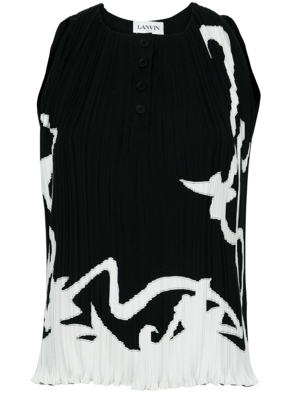 abstract-print pleated blouse Highlights - Black/white - Fully pleated - Plisse effect - Abstract pattern print - Round neck - Front button placket - Sleeveless - Scallop hem Imported Composition Polyester 100% SIZE & FIT Model measurements Height 5 ft 11 in(1.8 m) Bust/Chest 31.49 in(80 cm) Hips 36.61 in(93 cm) Waist 24.4 in(62 cm) FittingInformation Designed for a slim fit that sits just away from the body offering a close yet comfortable fit The pleated construction on this piece allows for additional movement and flexibility in the fit This piece fits true to size – take your usual size