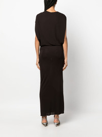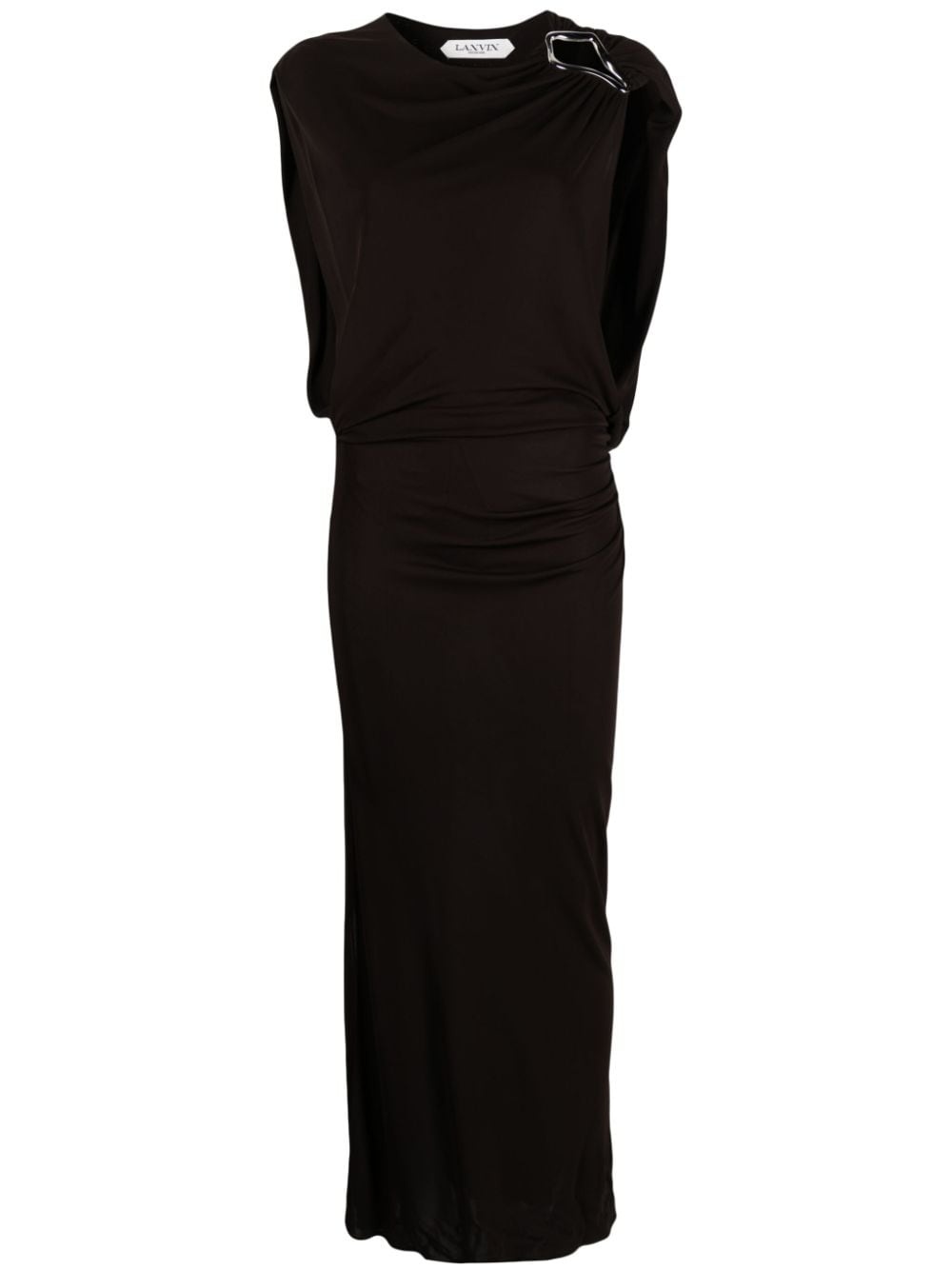 brooch-detail maxi dress Lanvin's elegant and ethereal aesthetic is captured in this maxi dress. Expertly cut in France from espresso-brown jersey, it boasts a softly draped neckline that is secured with a silver-tone metal brooch detail at the shoulder. Highlights - Coffee brown - Jersey texture - Draped detailing - Brooch detail - Round neck - Sleeveless - Ankle-length - Straight hem Made in France Composition Viscose 100% SIZE & FIT Model measurements Height 5 ft 10 in(1.78 m) Bust/Chest 33.07 in(84 cm) Hips 36.61 in(93 cm) Waist 24.8 in(63 cm) FittingInformation Designed for a loose fit at the chest and waist with a close fit at the hips Made from a midweight non-stretch fabric, this piece offers minimal elasticity when worn This piece fits true to size – take your usual size