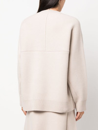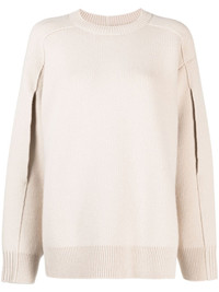 cape-back v irgin-wool blend jumper Lanvin gives knitwear a futuristic spin with this jumper from AW23. Retaining a classic round neck, it features split sleeves and a cape back for a contemporary appeal. Highlights - Beige - Virgin wool-cashmere blend - Panelled design - Crew neck - Long sleeves - Straight hem - Ribbed trim Imported Composition Virgin Wool 70%, Cashmere 30% SIZE & FIT Model measurements Height 5 ft 11 in(1.8 m) Bust/Chest 33.07 in(84 cm) Hips 37.4 in(95 cm) Waist 25.19 in(64 cm) FittingInformation Designed to be unstructured, offering a loose fit throughout Made with a midweight knit, this piece offers some stretch This piece fits true to size – take your usual size Washing instructions Hand Wash