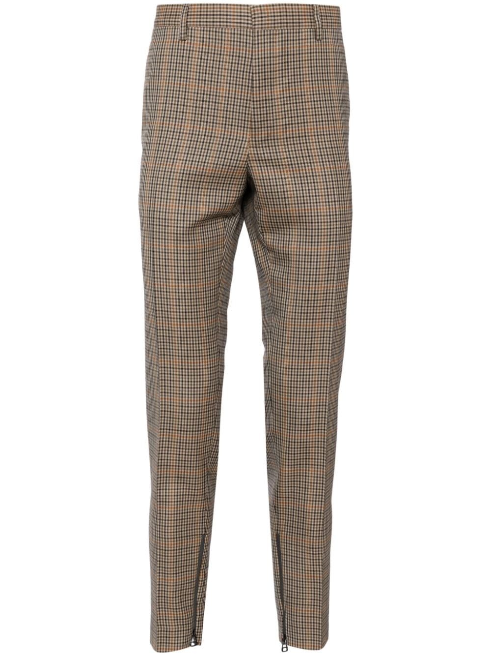 checked tapered trousers Highlights - Brown/multicolour - Wool - Check print - Mid-rise - Belt loops - Concealed front fastening - Two side slit pockets - Rear button-fastening pocket - Cuff zips Made in Italy Composition Outer: Wool 100% Lining: Viscose 100% SIZE & FIT Model measurements Height 6 ft 2 in(1.87 m) Bust/Chest 34.25 in(87 cm) Hips 36.22 in(92 cm) Waist 29.52 in(75 cm) FittingInformation Designed for a tapered leg, offering a loose unrestricted fit over the leg with a closer fit towards the ankle Made from a midweight non-stretch fabric This piece fits true to size – take your usual size