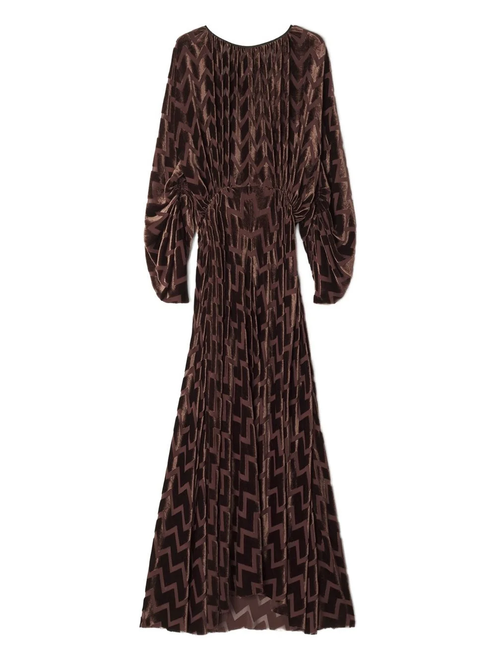 chevron-pattern maxi dress Highlights - Brown - Chevron pattern - Gathered waist - Long sleeves - Crew neck Made in Italy Composition Viscose 74%, Silk 26% Washing instructions Read Manufacturer Guidelines