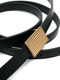 Concerto leather belt Crafted from leather, this belt from Lanvin is inspired by their Concerto bag clasp. It spotlights a diamond-point clasp in gold-tone hardware at the front of the accessory. Highlights - Black - Leather - Gold-tone clasp fastening Made in Italy Composition Leather 100%, Brass 100% SIZE & FIT Measurement Maximum Length 57.08 in(145 cm) Minimum Length 53.14 in(135 cm) WIDTH 0.59 in(1.5 cm)