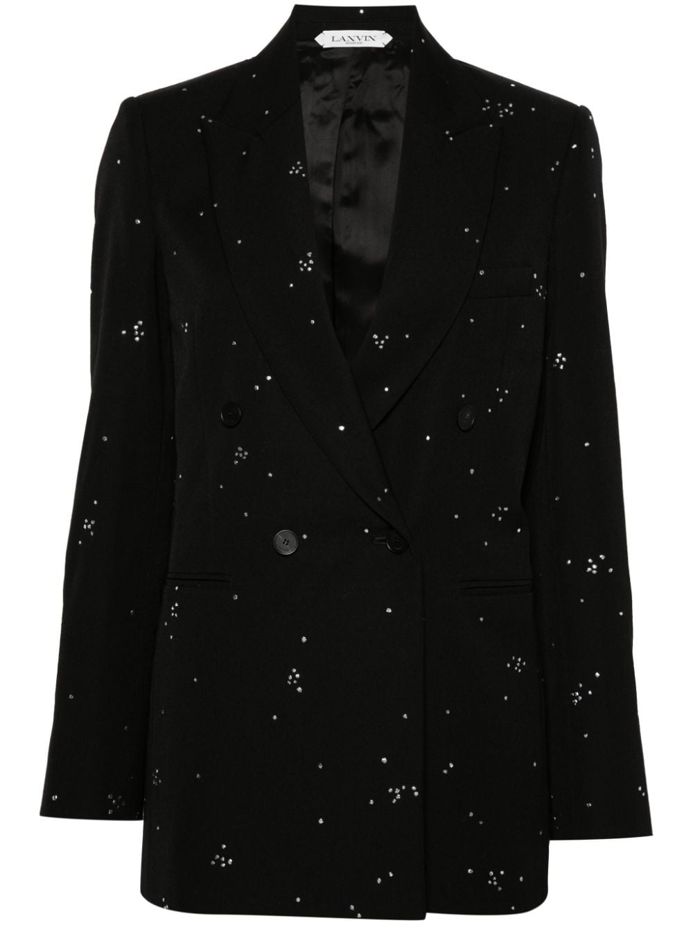crystal-embellished blazer Highlights - Black - Virgin wool - Crystal embellishment - Peak lapels - Shoulder pads - Long sleeves - Split cuffs - Chest welt pocket - Two front jetted pockets - Straight hem - Full lining - Double-breasted button fastening Made in France Composition Outer: Buffalo Horn 100%, Virgin Wool 100%, Copper 100% Lining: Viscose 100% SIZE & FIT Model measurements Height 5 ft 9 in(1.75 m) Bust/Chest 31.1 in(79 cm) Hips 36.22 in(92 cm) Waist 25.19 in(64 cm) FittingInformation Designed for a slim fit that sits just away from the body offering a close yet comfortable fit The internal shoulder pads offer a structured shape Made from a midweight non-stretch fabric This piece fits true to size – take your usual size Washing instructions Dry Clean Only