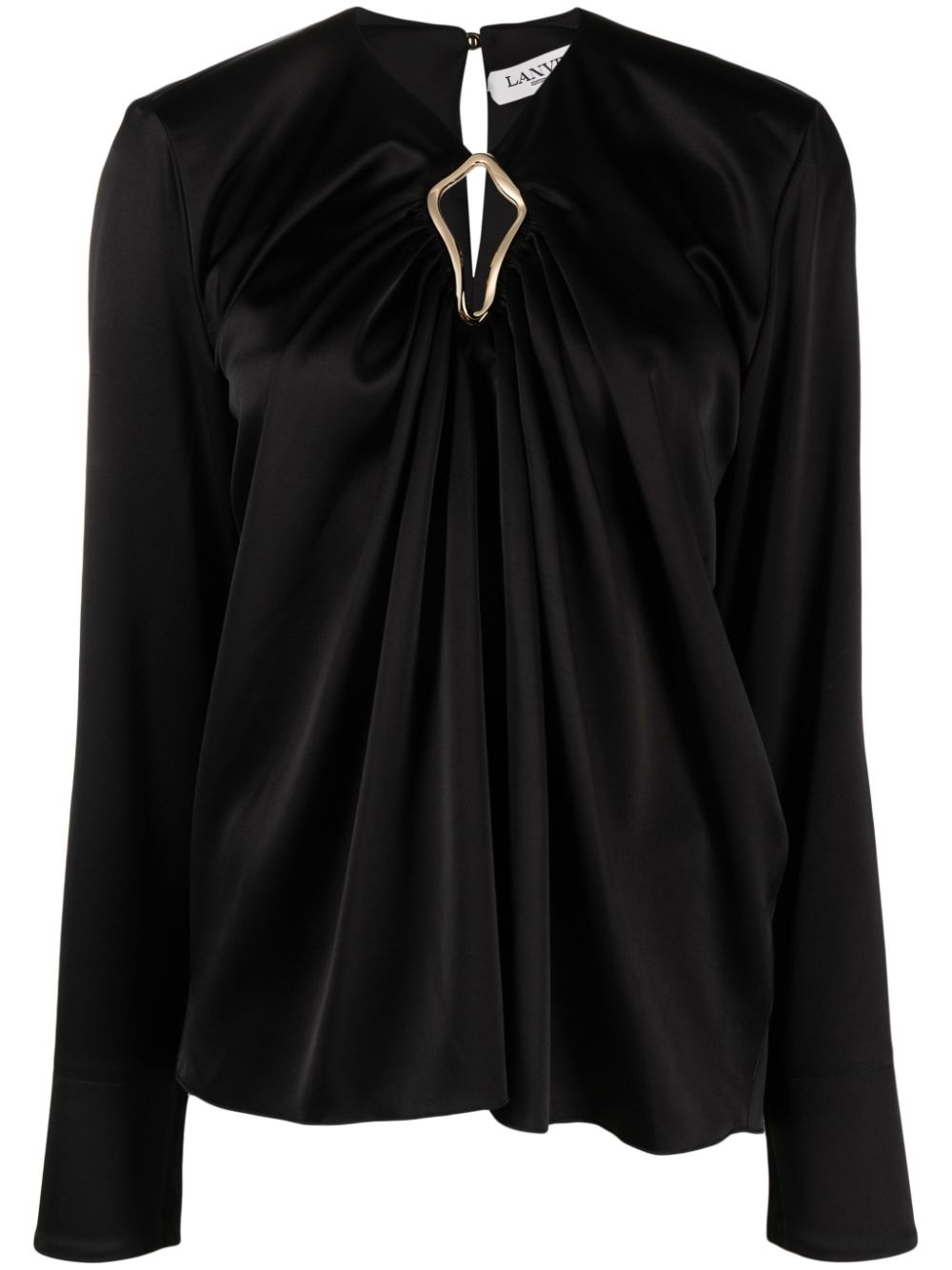 draped long-sleeved blouse Highlights - Jet black - Tonal stitching - Gold-tone hardware - Draped detailing - Round neck - Single rear button fastening - Long sleeves - Straight hem Imported Composition Outer: Triacetate 63%, Polyester 37% Lining: Acetate 73%, Silk 27% SIZE & FIT Model measurements Height 5 ft 9 in(1.75 m) Bust/Chest 31.49 in(80 cm) Hips 34.05 in(86.5 cm) Waist 24.21 in(61.5 cm) FittingInformation Designed to be unstructured, offering a loose fit throughout Made from a midweight non-stretch fabric This piece fits true to size – take your usual size Washing instructions Dry Clean Only