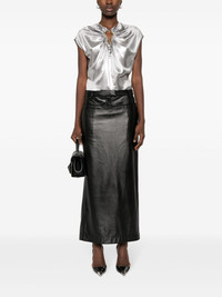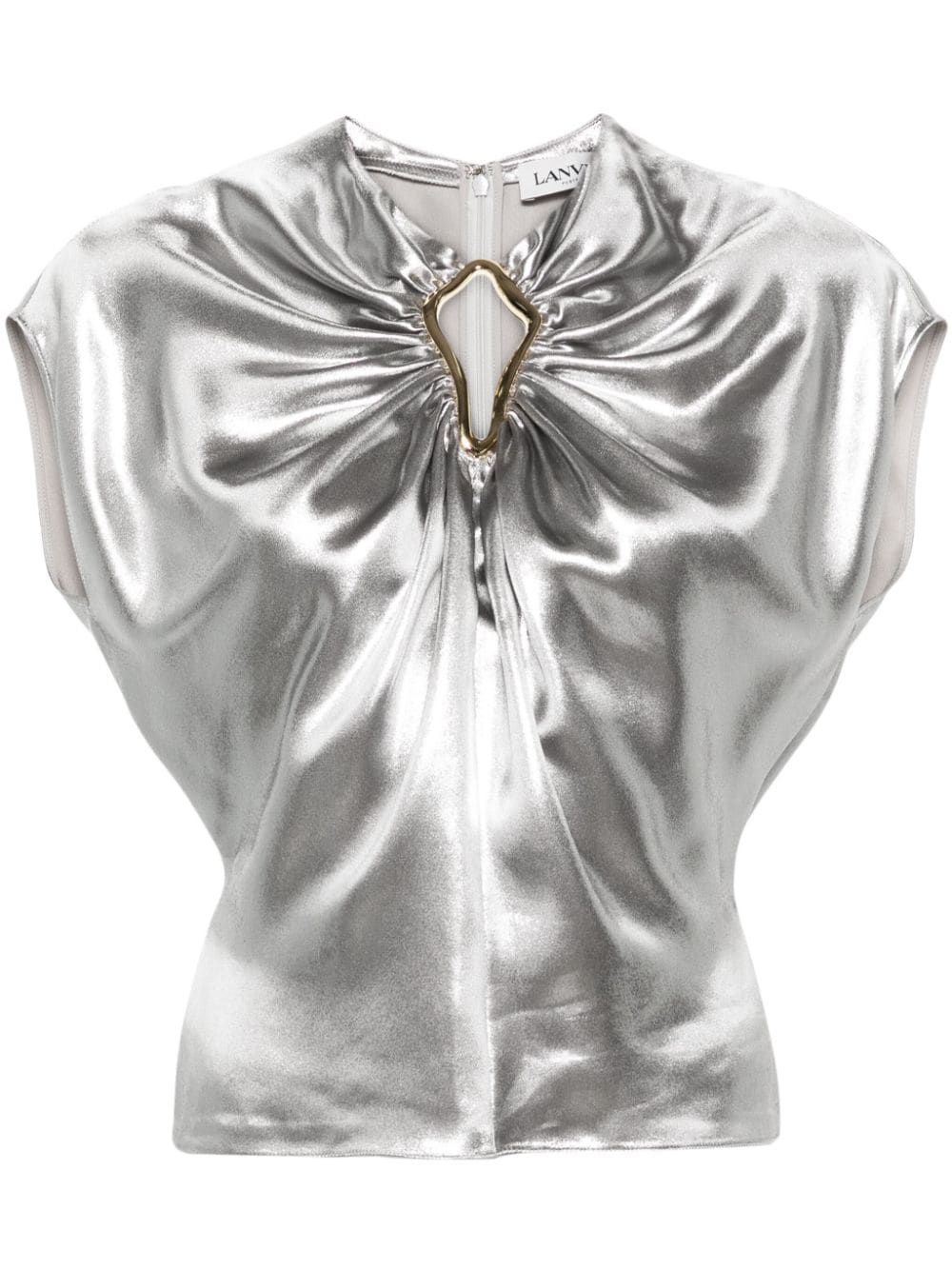 embellished lame top This silver Lanvin top is crafted from metallic lame that lends a liquid-like sheen to the gathered draping through the front. The sculpted gold-tone eyelet reveals a glimpse of skin ‘while paying tribute to the iconic legacy of the House.’ Highlights - Silver - Lame - Crew neck - Cap sleeves - Gold-tone eyelet embellishment - Cut-out detailing - Gathered detailing - Concealed rear hook and zip fastening Imported Composition Zamak 100%, Viscose 100% SIZE & FIT Model measurements Height 5 ft 11 in(1.8 m) Bust/Chest 32.67 in(83 cm) Hips 36.22 in(92 cm) Waist 24.4 in(62 cm) FittingInformation Designed for a slim fit that sits just away from the body offering a close yet comfortable fit Made from a lightweight non-stretch fabric This piece fits true to size – take your usual size Washing instructions Dry Clean Only