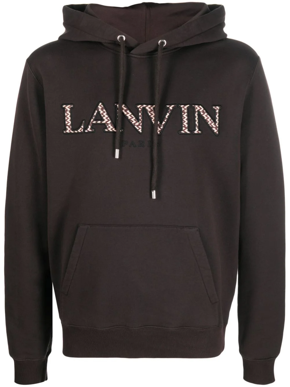 embroidered-logo cotton hoodie Lanvin elevates a relaxed silhouette with bold branding in this dark brown cotton hoodie. Zigzag patterning decorates the embroidered logo at the chest, nodding to the label's love of unexpected detailing. Imported Composition Cotton 100%, Polyester 100% SIZE & FIT Model measurements Height 6 ft 2 in(1.87 m) Bust/Chest 36.41 in(92.5 cm) Hips 37 in(94 cm) Waist 29.52 in(75 cm) Measurement CHEST 42.99 in(109.2 cm) SLEEVE LENGTH 25.98 in(66 cm) Shoulder Width 18.5 in(47 cm) WAIST 37.99 in(96.5 cm) FittingInformation Designed for a regular fit, offering a comfortable loose fit throughout the body The ribbed hem offers a close, comfortable fit Made from a midweight non-stretch fabric, this piece offers minimal elasticity when worn This piece fits true to size – take your usual size Washing instructions Machine Wash