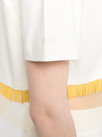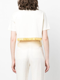 fringed cropped T-shirt Crafted from milky white cotton with a tulle band for a visible lining effect, this cropped T-shirt from Lanvin is embellished with a yellow glass beaded fringe for a sleek finish. Highlights - Milk white - Cotton - Tulle inserts - Fringed edge - Round neck - Short sleeves - Cropped Imported Composition Cotton 100%, glass 100%, Polyamide 100% SIZE & FIT Model measurements Height 5 ft 10 in(1.79 m) Bust/Chest 32.67 in(83 cm) Hips 34.25 in(87 cm) Waist 24.4 in(62 cm) FittingInformation Designed to be unstructured, offering a loose fit throughout Cropped in length Made from a midweight non-stretch fabric, this piece offers minimal elasticity when worn This piece fits true to size – take your usual size Washing instructions Hand Wash