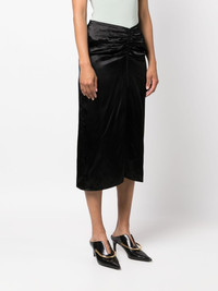 gathered-waist midi skirt France's oldest couture house, Lanvin is renowned for its 'ageless elegance' with a modern twist, as seen with this satin midi skirt. The classic silhouette is elevated with gathered detailing at the waist, enhancing the fit of the garment. Highlights - Black - Satin finish - Gathered detailing - High-waisted - Rear slit - Mid-length Imported Composition Viscose 100% SIZE & FIT Model measurements Height 5 ft 10 in(1.77 m) Bust/Chest 31.49 in(80 cm) Hips 36.22 in(92 cm) Waist 22.44 in(57 cm) Washing instructions Dry Clean Only