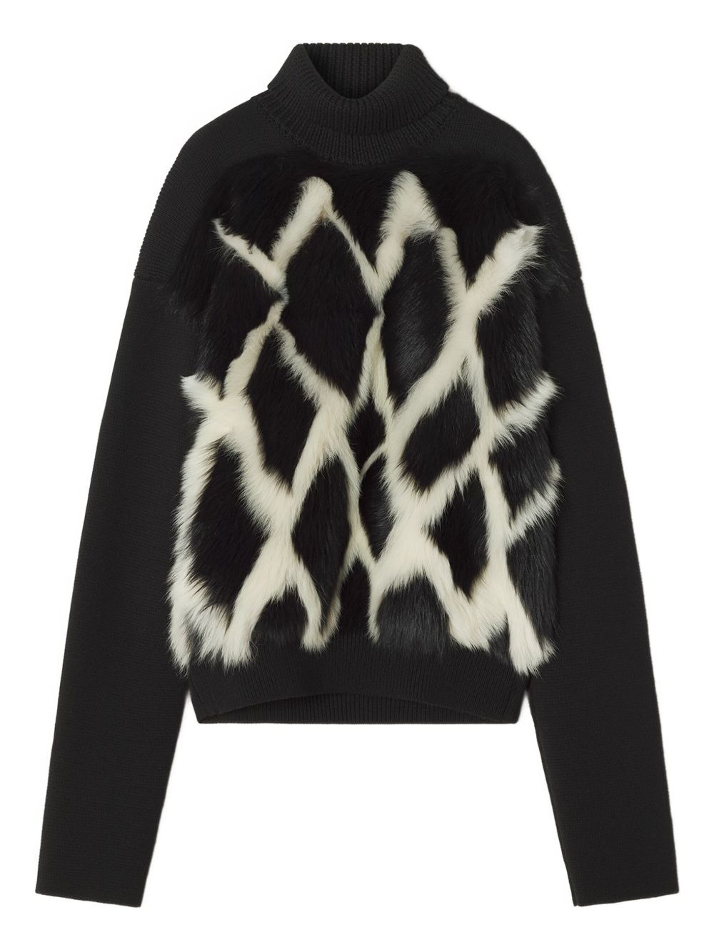 high-neck fur-panel sweater Highlights - Black - High neck - Faux fur panel - Diamond pattern - Dropped shoulder Made in Italy Composition Outer: Wool 100% Lining: Silk 100% Washing instructions Read Manufacturer Guidelines