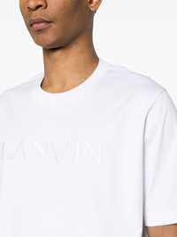 logo-embroidered cotton T-shirt Lanvin elevates this simple white T-shirt with branded detailing. Spun in Portugal from cotton jersey, it's decorated with a tonal embroidered logo on the front for a distinctive yet sleek look. Highlights - Optical white - Cotton - Jersey texture - Embroidered logo to the front - Crew neck - Short sleeves - Straight hem Imported Composition Cotton 100%, Polyester 100% SIZE & FIT Model measurements Height 6 ft 2 in(1.87 m) Bust/Chest 36.22 in(92 cm) Hips 37 in(94 cm) Waist 27.95 in(71 cm) FittingInformation Designed for a relaxed fit, this piece allows for comfort and movement when worn Made from a midweight non-stretch fabric, this piece offers minimal elasticity when worn This piece fits true to size – take your usual size