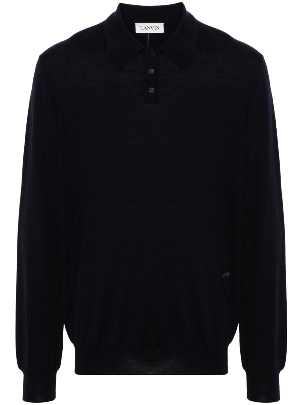 logo-embroidered polo shirt Highlights - Midnight blue - Merino wool - Fine knit - Polo collar - Long sleeves - Embroidered logo to the front - Ribbed cuffs and hem - Contrast stitching to the rear - Short front button fastening Made in Italy Composition Polyester 100%, Merino 100% SIZE & FIT Model measurements Height 6 ft 0 in(1.84 m) Bust/Chest 35.82 in(91 cm) Hips 37 in(94 cm) Waist 28.34 in(72 cm) FittingInformation Designed for a relaxed fit, this polo shirt offers comfort and movement The ribbed hem offers a close, comfortable fit Made with a midweight knit, this piece offers some stretch This piece fits true to size – take your usual size Washing instructions Hand Wash