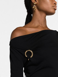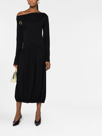 long-sleeve asymmetric midi dress In keeping with its polished aesthetic, Lanvin presents its take on the classic LBD with this midi dress. Boasting a striking asymmetric neckline and pleated skirt, it is further enhanced by a gold-tone Brooch detail at the chest. Imported Composition zamac 100%, Acetate 80%, Polyamide 20% SIZE & FIT Model measurements Height 5 ft 10 in(1.77 m) Bust/Chest 32.28 in(82 cm) Hips 34.25 in(87 cm) Waist 24.01 in(61 cm) FittingInformation This piece fits true to size. We recommend you get your regular size Designed for a close fit at the bust and waist, but loose at the hip Made with a mid-weight fabric Washing instructions Dry Clean Only