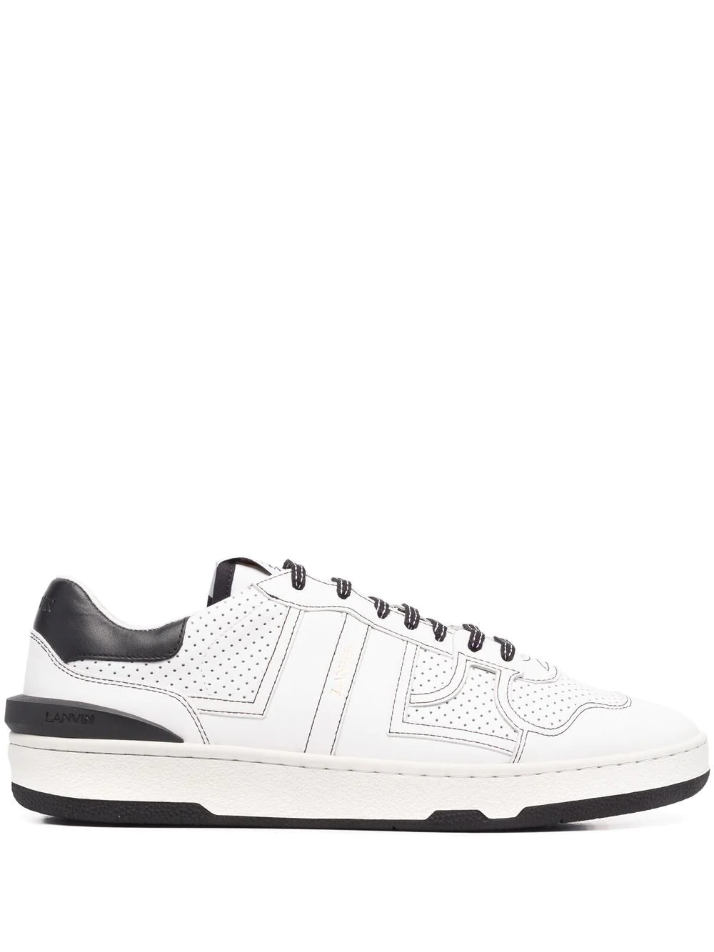 perforated-panel leather sneakers Crafted to a sleek, low-top silhouette, these LANVIN sneakers are finished in contrasting white and black hues and detailed with perforated panels. This creates a modern finish for the sporty pair. Imported Composition Outer: Calf Leather 100% Sole: Rubber 100% Lining: Polyester 70%, Calf Leather 30% SIZE & FIT Measurement HEEL 1.37 in(3.5 cm)