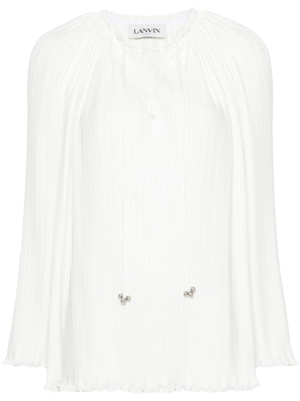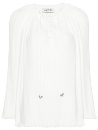 plisse lace-up blouse This white blouse is a modern interpretation of one of Lanvin's signature fabrics: the charmeuse. It is cut from crepe de chine and fully pleated to enhance the fluid silhouette. Highlights - Off-white - Plisse effect - Bead embellishment - Frilled neckline - Front lace-up fastening - Long sleeves - Lettuce hem - Silver-tone hardware Imported Composition Polyester 100%, Rayon 100%, Brass 100% SIZE & FIT Model measurements Height 5 ft 10 in(1.78 m) Bust/Chest 31.49 in(80 cm) Hips 37 in(94 cm) Waist 23.62 in(60 cm) FittingInformation Designed to be unstructured, offering a loose fit throughout The adjustable drawstring means that you can adjust this piece’s fit to suit your comfort and preference The pleated construction on this piece allows for additional movement and flexibility in the fit This piece fits true to size – take your usual size