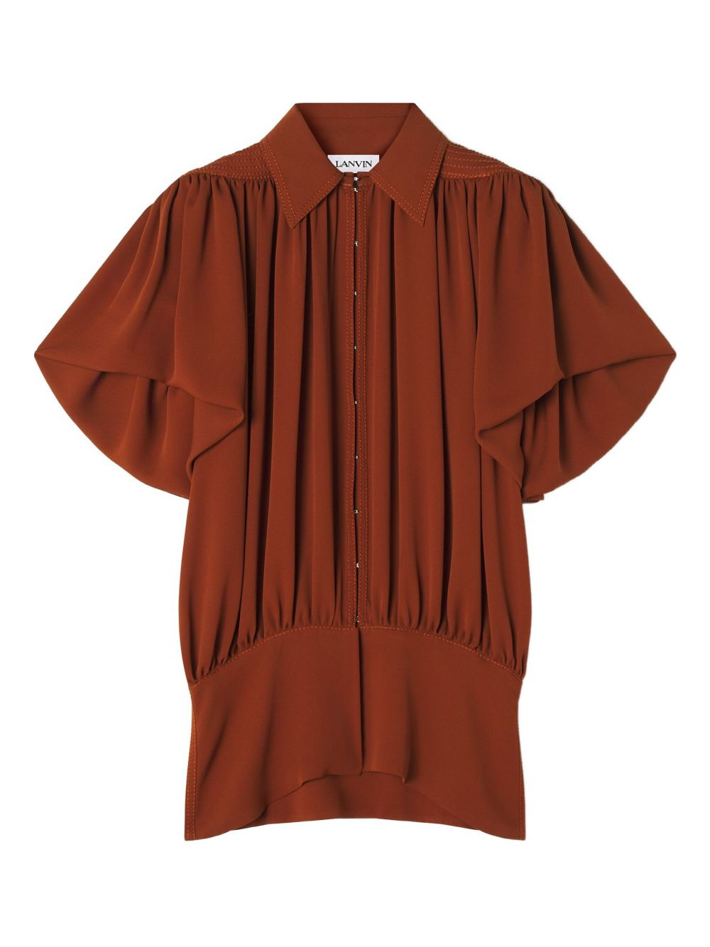 puffed-sleeve button top Highlights - Orange - Puffed sleeves - Button front fastening - Gathered detailing - Fitted waist - High neck Imported Composition Silk 100% Washing instructions Read Manufacturer Guidelines